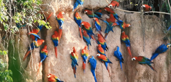 Глиняные «лизунцы» в национальном парке Ясуни. В августе тысячи ярких птиц собираются на лизунах, чтобы восполнить свой рацион в период размножения, а для туристов – это захватывающее явление.